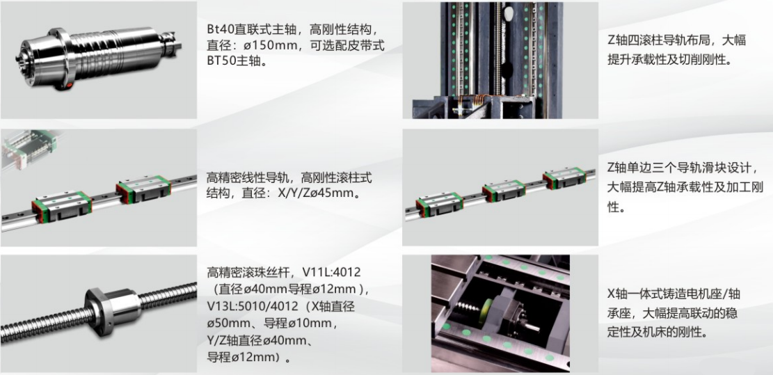 4:Z軸采用進(jìn)口超負(fù)荷滾柱線軌,標(biāo)準(zhǔn)六個滑塊,剛性好,精度高,重切削能力強